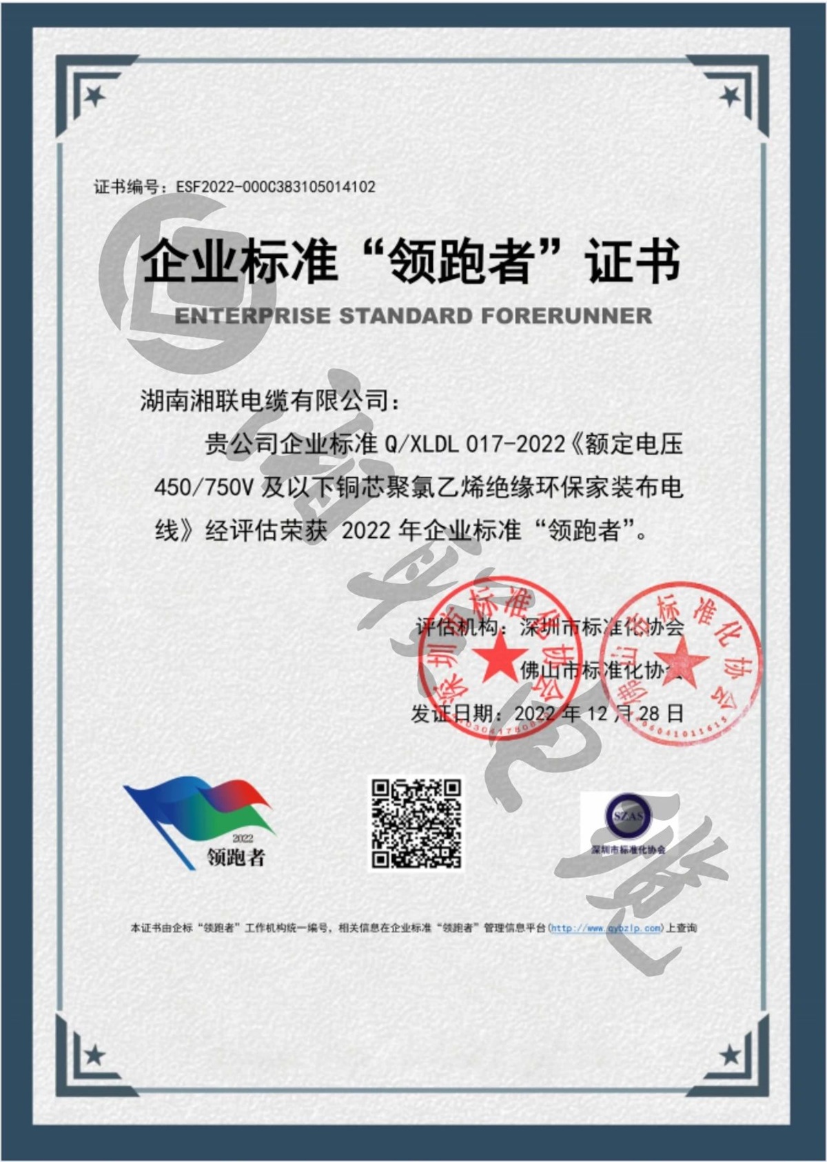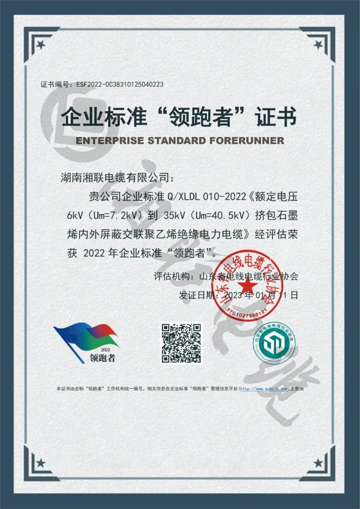 1月,湖南湘聯(lián)電纜有限公司三項(xiàng)企業(yè)標(biāo)準(zhǔn)經(jīng)評(píng)定,榮獲2022年全國(guó)企業(yè)標(biāo)準(zhǔn)“領(lǐng)跑者”。