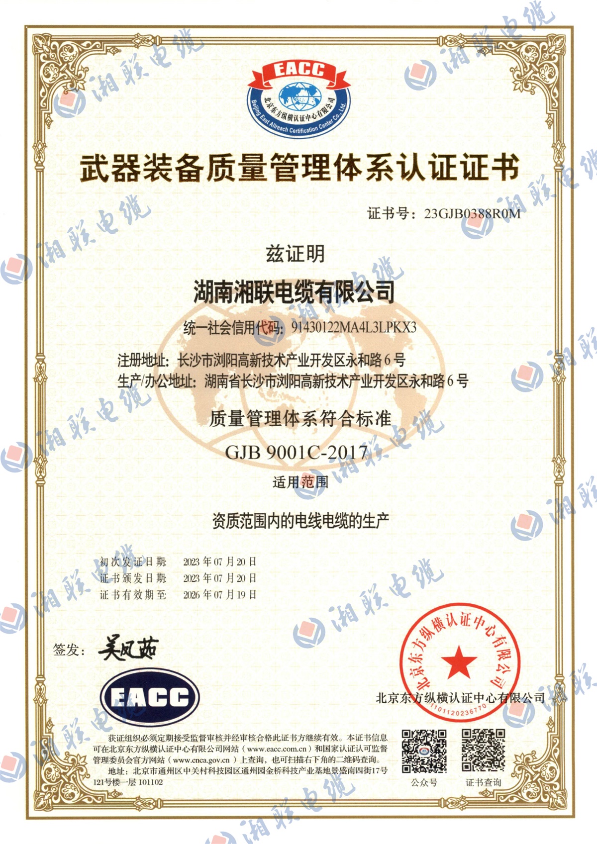 7月,湘聯(lián)電纜順利通過(guò)國(guó)軍標(biāo)質(zhì)量管理體系認(rèn)證,獲得《武器裝備質(zhì)量管理體系認(rèn)證證書》。
