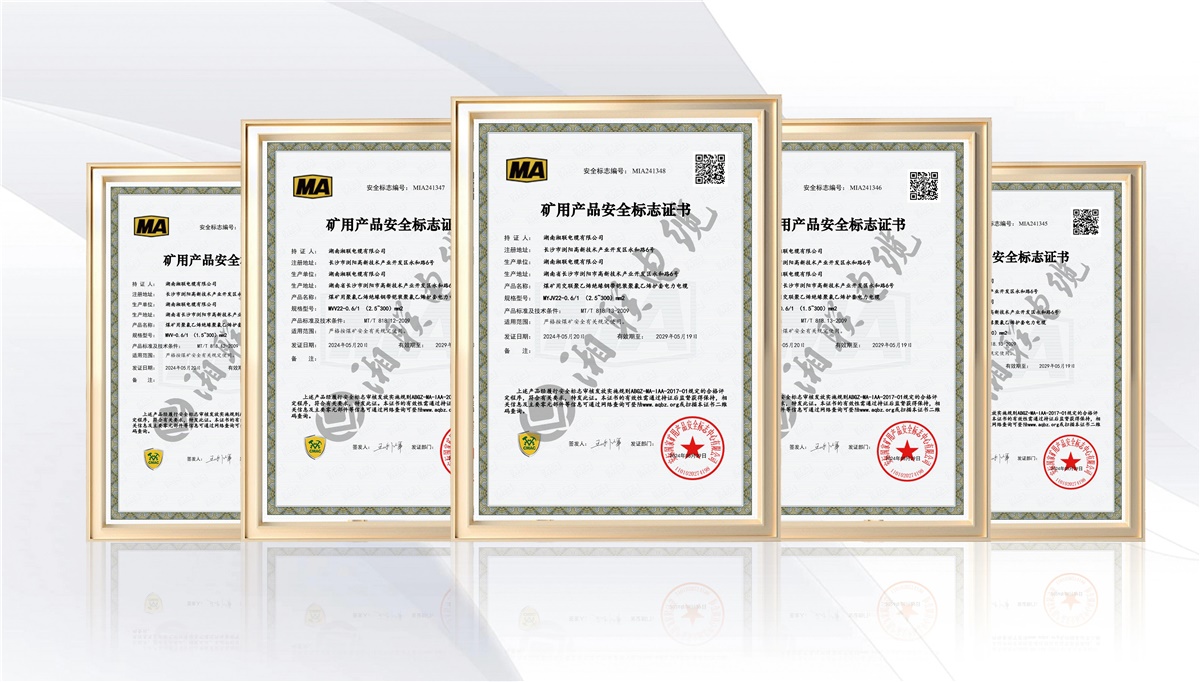 礦用電纜必須嚴格遵守國家及行業(yè)雙重標準,需按照GB/T 12972《礦用橡套軟電纜》、MT818-2009《煤礦用阻燃電纜》生產,都應經過安標國家礦用產品安全標志中心頒發(fā)礦用產品安全標志證書,才能向市場出售 。近期,湘聯(lián)電纜的MVV-0.6/1(1.5~300)mm2煤礦用聚氯乙烯絕緣聚氯乙烯護套電力電纜、MYJV-8.7/10(25~300)mm2煤礦用交聯(lián)聚乙烯絕緣聚氯乙烯護套等6款電力電纜成功取得礦用產品安全標志證書,其產品在阻燃、耐壓、抗拉強度等方面均達到行業(yè)標準。